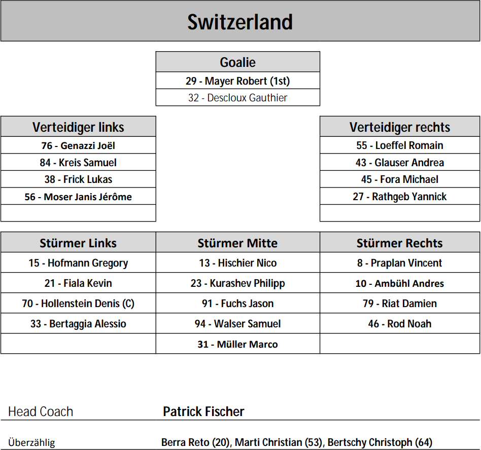 Patrick Fischer wechselt den Schlussmann und bringt in Genf Robert Mayer. Zudem spielt in der Verteidigung Yannick Rathgeb heute mit Janis Moser und Genazzi mit Loeffel. Dafür muss Christian Marti auf der Tribüne Platz nehmen. Hofmann und Fiala tauschen im Sturm die Linien und Samuel Walser spielt in der vierten Linie anstelle von Christoph Bertschy, welcher heute überzählig ist. Marco Müller ist 13. Stürmer.