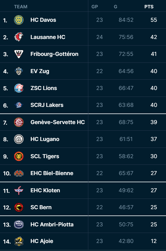 | 7 | ![]() | Genève-Servette HC | Genève | 23 | 11 | 1 | 1 | 8 | 0 | 2 | 68:75 | -7 | 39 |