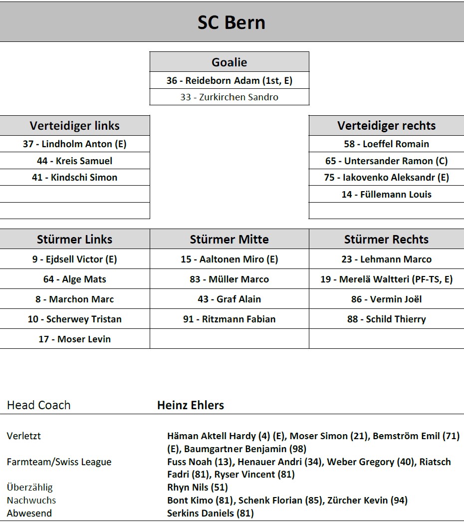 | 10 | ![]() | SC Bern | SC Bern | 41 | 12 | 4 | 3 | 19 | 2 | 1 | 91:104 | -13 | 53 |