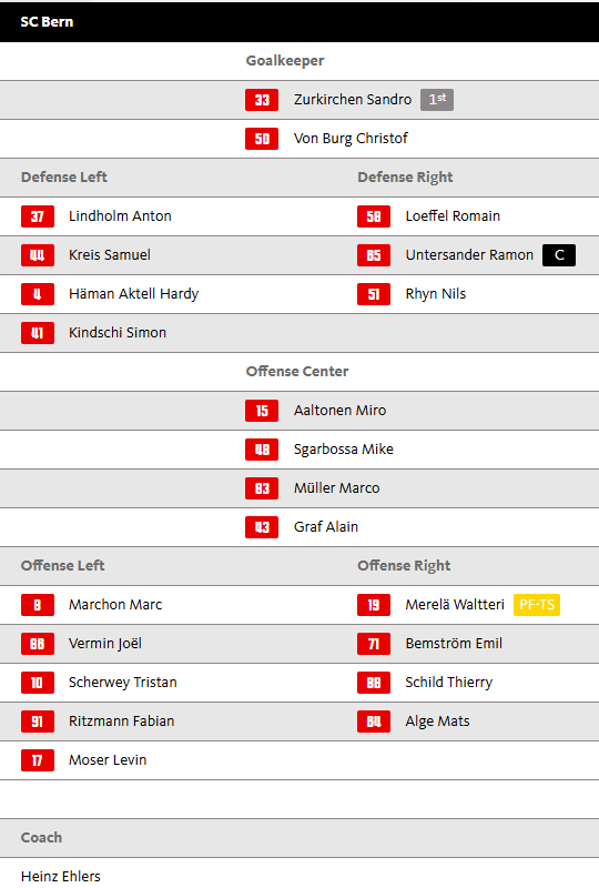 | 9 | ![]() | SC Bern | SC Bern | 49 | 15 | 5 | 3 | 21 | 4 | 1 | 112:119 | -7 | 66 |