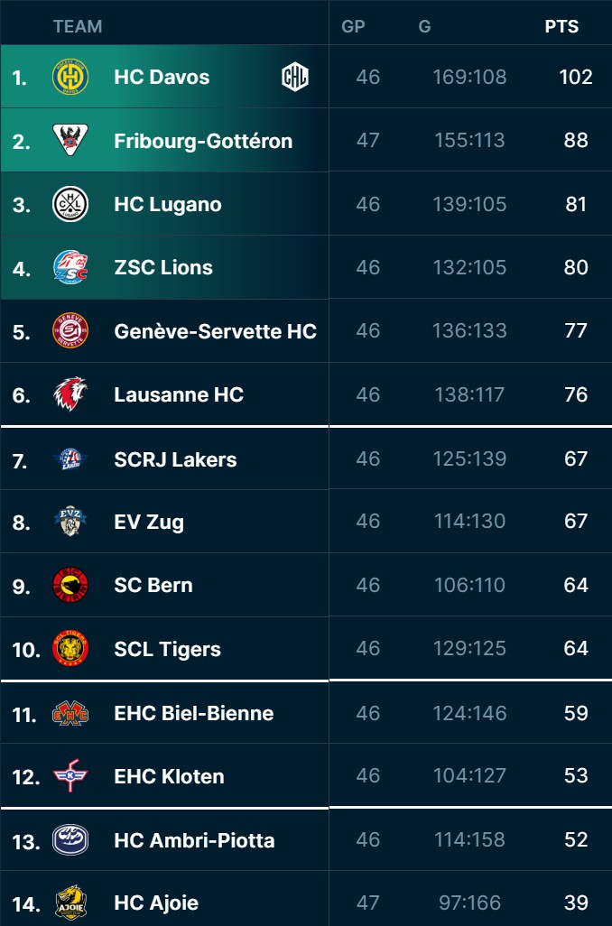 Der HC Lugano geht mit einer starken Position in die entscheidende Phase der Qualifikation. Nach 46 Partien stehen die Tessiner mit 81 Punkten auf Rang drei. Der Vorsprung ist allerdings hauchdünn: Auf Platz vier lauern die ZSC Lions mit nur einem Zähler Rückstand.