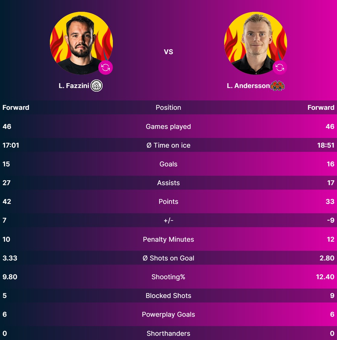 Beim HC Lugano trägt Luca Fazzini den gelben Helm. Der Schweizer hat bisher 15 Tore erzielt und 27 Assists geliefert. Beim EHC Biel-Bienne ist Lias Andersson der beste Punktesammler. Der Schwede hat 16 Tore und 17 Assists auf dem Konto.