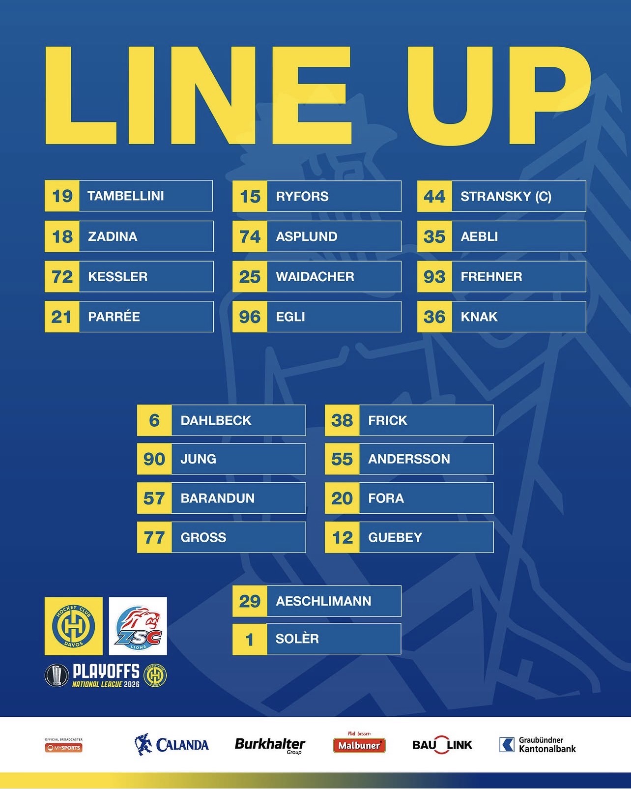 Bei den Gästen aus Zürich gibt es keine Veränderungen im Line-up. Das heisst, Sven Andrighetto fehlt nach wie vor verletzt. In der fünften Partie zog sich Valentin Nussbaumer eine Verletzung zu. Deswegen kommt es im Sturm zu Veränderungen. Beni Waidacher übernimmt 1:1 die Position von Nussbaumer. Matej Stransky wechselt von der dritten in die erste, Niklas Aebli von der fünften in die zweite und Yannick Frehner von der ersten in die dritte Linie. Zurück im Line-up ist Enzo Guebey, der mit Nico Gross zusammen spielt.