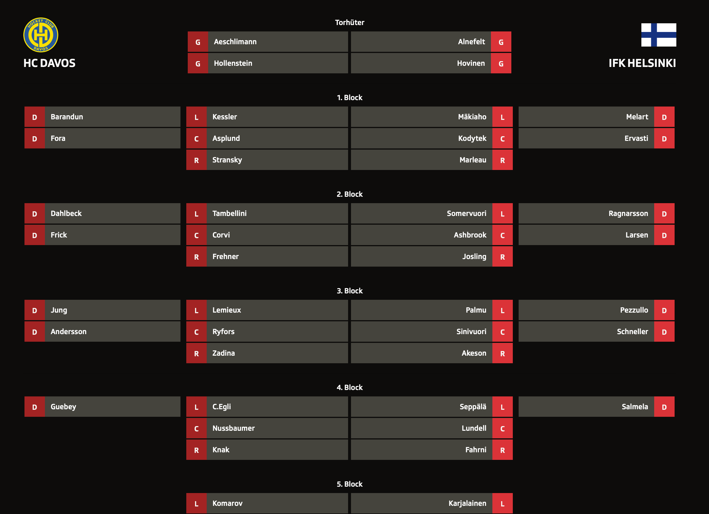 Folgende Spieler werden heute auf das Eis geschickt von den Trainern Josh Holden (HC Davos) und Olli Jokinen (IFK Helsinki):