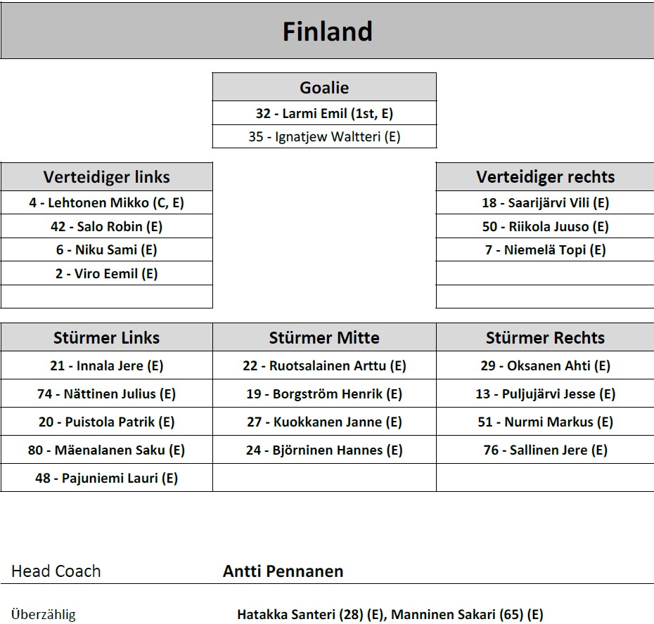 Die Finnische Nationalmannschaft zeigt in den letzten Wochen durchwachsene Leistungen. Von den letzten fünf Spielen konnten die Finnen nur eines gewinnen: Am 8. November bei den Finnish Ice Hockey Games zu Hause besiegten sie Tschechien mit 4:2. Die übrigen Partien verliefen hingegen enttäuschend: Es setzte zwei Niederlagen gegen Schweden, eine gegen die Schweiz und eine weitere gegen Tschechien. Damit hat Finnland derzeit noch keinen Punkt im laufenden Turnier sammeln können und liegt auf dem letzten Tabellenplatz. Die bisherigen Ergebnisse zeigen, dass die Mannschaft zwar phasenweise gefährlich sein kann, in Konstanz und Effizienz aber noch Defizite bestehen.