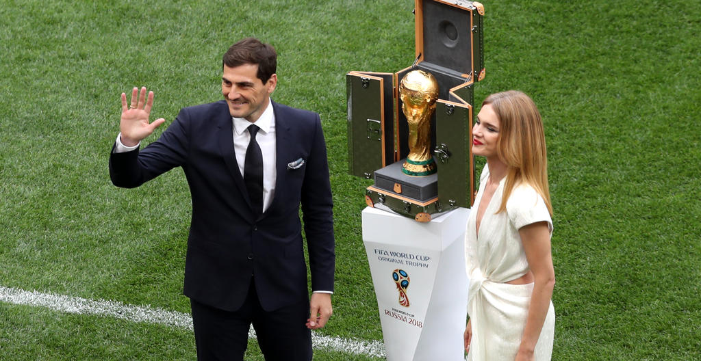 Spaniens Torwartlegende Iker Casillas und das russische Model Natalia Vodianova präsentieren die WM-Trophäe.