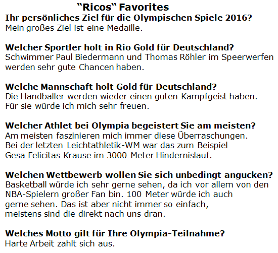 Ich will in Rio unbedingt eine Medaille holen, das ist mein Ziel! Aber es wird wirklich schwer. Zum einen wegen der starken Konkurrenz. Zum anderen ist es sehr schwer, immer diese Leistungen abzurufen. Ich bin jetzt eigentlich ganz gut drauf. Aber damit ist es nicht getan. Ich muss gesund bleiben, an den Wettkampftagen eine super Form haben und so weiter. Wenn ich am Ende da stehe und mir nichts vorwerfen kann und meinen bestmöglichen Wettkampf abgeliefert habe, dann werde ich am Ende auch mit einem sechsten Platz zufrieden sein.